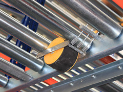 滾筒線按一定角度傾斜固定在貨架橫梁上,托盤從高端放入,沿滾筒線靠本身重力下滑,為控制托盤以穩(wěn)定速度下滑,避免撞擊,在滾筒線上每隔一定距離設置一套阻尼系統(tǒng),托盤下滑速度越快,阻尼系統(tǒng)產(chǎn)生的阻力越大。端部分離機構設置在低端,用來分離低端相臨的兩個托盤,這樣低端托盤就可以順利地取出。重力式貨架的空間利用率又高于后推式貨架及貫通式貨架,而且實現(xiàn)了“先進先出”的原則,安全性及運轉效率都與貨位式貨架相同,廣泛應用與各行業(yè)。