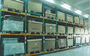 后推式貨架系統(tǒng)(也稱為壓入式貨架),此貨架系統(tǒng)高效地利用了存儲空間,經(jīng)常用為物流中心貨架。依據(jù)“先進后出”的原則把貨物放置在傾斜的滾道上,運載臺車沿軌道運行,托盤放置在運載臺車上依次被后推至貨架內(nèi)部,有效深度在5個托盤位,取貨時第一個拉盤提取后,下一個托盤自行滑至取貨點,有效地利用單一通道進行存取,尤其適用于貨物中轉(zhuǎn)區(qū)的存儲管理。